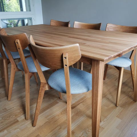 Kotimainen tuote. Tilattu valmistajalta (Anttiina) reilu vuosi sitten omilla mitoilla. Ryhmä ollut erittäin vähäisellä käytöllä eikä käytönjälkiä ole. Kunto vastaa uutta. Ei ole naarmuja tms pöydässä tai tuoleissa. Pöytä ja tuolit erittäin tukevia.