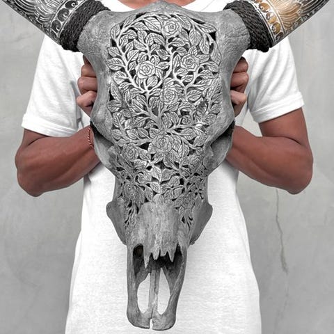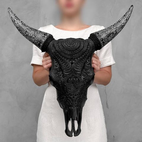 Ei varaushintaa - Upea harmaa naudan kallo boheemisti kaiverrettujen sarvien