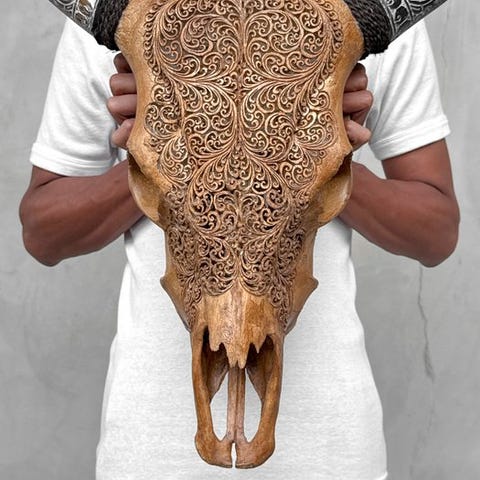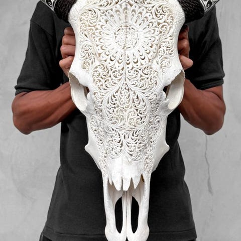 Tämä veistetty lehmäkalvo-sääri/lehmäkallo on upea kodin sisustusesine, joka elävöittää mitä tahansa kotia tai ravintolaa. Enemmän kuin vain hengellinen ja kulttuurinen taideteos; se kertoo myös Indonesian alkuperäiskuntien käsityöläisten tarinan, jotka säilyttävät tavan käyttää jokaisen eläimen osan käsityöläisen ikuisen työn taiteeksi. Tämä kallo on käsityönä tehty Indonesiassa, jossa eläinkalloihin hakkaamisen taito siirtyy isältä pojalle. He ovat hallinneet tämän ovelan tekniikan ja siihen kuluu noin 5–6 päivää yksityiskohtaisten, kaiverrettujen kuvioiden, kuten tässä esimerkissä, kuvaamiseen. Sarvet on myös kaiverrettu boheemilla tyylillä.Kaiverrettu on kaunis Star Mandala -aihe.LÄHITILAT/MITATKorkeus: 61 cmLeveys: 59 cmSAAJAN ILLAN SÄÄNNÖT/Disclaimer- Kallon takaosaan on kiinnitetty nyöri, jotta sen voi asentaa seinälle.- Siirtämisen vuoksi sarvet irrotetaan, ja ne on helppo kiinnittää uudelleen. Sarvet ovat aina pakattu kuitenkin kallon pohjaan pakkaukseen. Poista please sarvet ennen pakkauksen heittämistä pois.- Koska kyseessä on luonnollinen kallo, siinä voi olla joitakin luonnollisia pieniä halkeamia, uurteita tai irtoavia hampaita. Tämä on normaalia. Katso kuvat.- Kallomme puhdistetaan ammattilaisenn, mutta joitain pieniä väripoikkeamia esiintyy joskus hampaissa. Tämä on luonnollista ja normaalia, eikä sitä voi tehdä paljon.- Olemme lisänneet muutaman kuvan käsityöläisistämme työn touhussa antamaan vaikutelman siitä, miltä käsin kaivertuvan kallon luominen näyttää.- MAINITSEMUKSEEN PAINO LUKEE PAKKAUSTA KANSSA.LÄHETYS/TOIMITUS- Esine lähetetään seurantakoodilla DHL Parcelin, DPD:n tai postNl:n kautta. Seuranta päivittyy Catawiki-esiin, kun paketti on jätetty postiin.- Tarkista säännöllisesti, ettei pakettia palauteta meille, jolloin ostaja vastaa toisen toimituksen lähetyskustannuksista.- Seurantaa varten Espanjaan ja Portugaliin käytä tätä linkkiä ja lisää Catawiki-esiin saamasi seurantanumerohttps://clientesparcel.dhl.es/LiveTracking/Home- EMME YHDISTÄ TOIMITUKSIA!!!- Jos sinulla on kysyttävää pakettisi suhteen, ota meihin yhteyttä Catawiki-viestipalvelun kautta. Yritämme vastata kolmen työpäivän kuluessa.