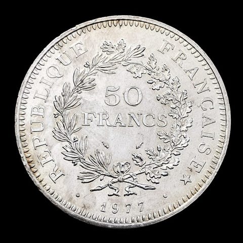 Ranska. Silver 50 Francs "Hercules" Coin 1974 ()