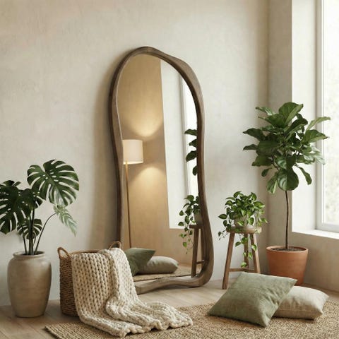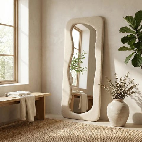 Nami-peili tuo sisustukseen pehmeää eleganssia ja modernia muotokieltä. Sen aaltoileva, orgaaninen siluetti tekee peilistä näyttävän sisustuselementin, joka toimii yhtä hyvin käytännöllisenä täyskorkeana peilinä kuin huoneen tunnelmaa keventävänä design-esineenä. Pehmeä kangasverhoiltu kehys luo lämpimän ja kutsuvan ilmeen, joka sopii täydellisesti makuuhuoneeseen, vaatekaapin yhteyteen tai eteisen viimeisteleväksi yksityiskohdaksi.