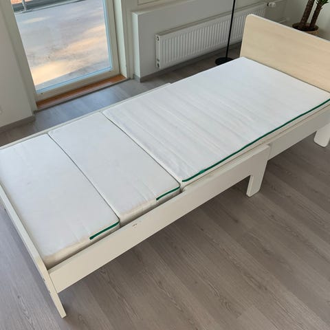 Myydään puoli vuotta käytössä ollut, uutena meille ostettu Ikea Släkt jatkettava sängynrunko + sälepohja + patja.