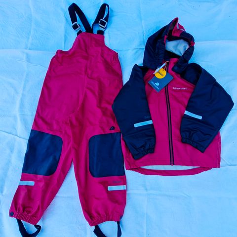 Kaksiosainen setti, johon kuuluu sininen-musta takki hupulla sekä mustat henkselihousut. Materiaali on vedenpitävä, ja asussa on heijastinnauhat lahkeissa ja hihoissa. Soveltuu ulkoleikkeihin ja sateiseen säähän.