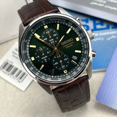Upea ja laadukas Seiko-kello, viitenumero SSB405P1. Kellon voimanlähteenä on kvartsikoneisto (Seiko Caliber 8T63) ja siinä on kronografi ja päivämääränäyttö. Kellon on helppo lukea vihreän kellotaulun ja kontrastoitujen indeksien ja käsien ansiosta.Uusi ja käyttämätön!Kellon on teräskotelossa ja se toimitetaan mukana olevalle nahkarannekkeelle.Toimitetaan mukaan laatikko ja leimattu kortti.Kellon koneisto: Kvartsikoneisto (Seiko Caliber 8T63)Kotelon materiaali: terästäHalkaisija: n. 41,5 mm ilman korun.Kotelon paksuus: n. 12 mmLasi: hardlex.Rannekkeen pituus: n. 22 cm, mukaan lukien kello.Valmistusvuosi: 2024Toimitus vakuutettu.Kuvat ovat osa kuvausta.