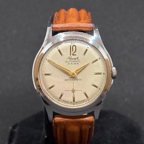 Junghans - pukukello - cal Junghans 93 - hyvä esteettinen kunto ja erinomaiset toimivuuskunnot. Kaunis, elegantti, erittäin keräilijöiden arvostama ja todellakin vaikea löytää. Ajatellaan noin vuonna 1955.Kaunis ja erittäin raffinertti kaksivärinen champagnen/musta kellotaulu hyvissä kunnossa, jossa on asennetut viivamittaiset indeksit, täysin Bauhaus-tyylin mukainen. Kaunis kromattu kotelo erinomaisessa kunnossa ja napattavalla pohjalla varustettu teräskansi erinomaisessa kunnossa.Uusi ruskea nahkariipus, soljellinen sulkumerkki.Junghansin in-house 93-liike: yksi talon arvostetuimmista mekanismeista, liike toimii täydellisesti.Mielenkiintoiset mitat: 33 mm kruunulla; 32 mm ilman kruunua; 40 mm korvakkeiden väliin.Kuvat puhuvat puolestaan, keräilykello.Speditio seurattavissa