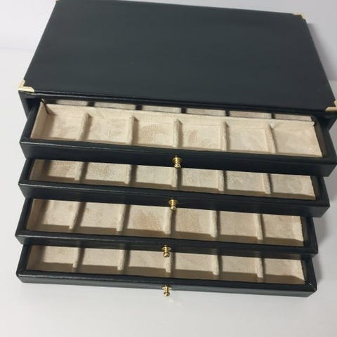 Kolikkoteline mustasta keinonahasta, 72 paikkaa4 ulosvetotikkaaSisäpuoli mustaKullanväriset metalliosatMitta 34 x 19 x 19 cmSisäisten jakajien mitat noin 5 x 4,5 cmKolikkoteline on täysin käsin valmistettu korkealaatuisista materiaaleista.Valmistettu puusta ja keinonahasta.Erinomainen kunto, uudenveroinen.Huolellinen toimitus