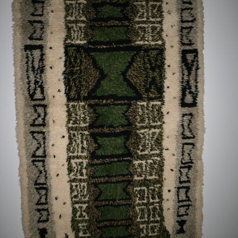 Käsinkudottu villaryijy. "Aurinkokello". Suunnittelija Kirsti Ilvessalo