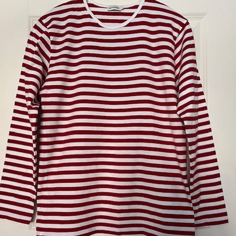 Marimekon unisex-mallinen raitapaita. Kokomerkintä kulunut pois, mutta M-koko, kai-kai -mitta 52 cm. Pesty usein, värit säilyneet yllättävän hyvin, mikä näkyy parhaiten resorikuvista. Kunto kohtalainen, kulumaa toki on.