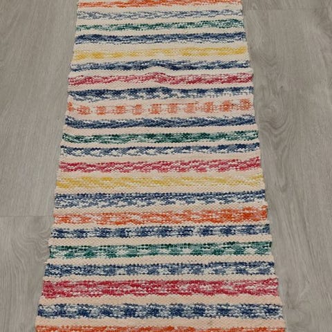 Kohtalaisessa kunnossa oleva räsymatto, päissä rispaantumia jotka vaativat korjausta. Koko 140 cm x 60 cm. Materiaali puuvilla.