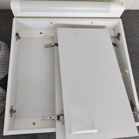 Kulunut puinen peilikaappi. Sisälle kaksi lasihyllyä ja keskelle liukuovi kuluneella peilillä, joka nyt kuvissa irrallaan. Leveys 70, korkeus 55, syvyys 11,8 ilman ovia.