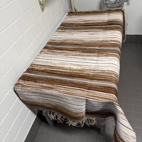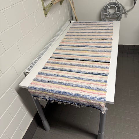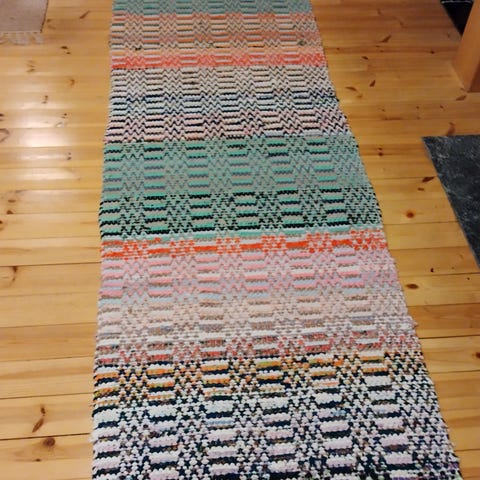 Hyväkuntoinen pitkä räsymatto, koko 200cm x 60 cm, ollut pitkään varastossa käyttämättömänä. Päissä pientä rispaantumaa. Materiaali puuvilla.