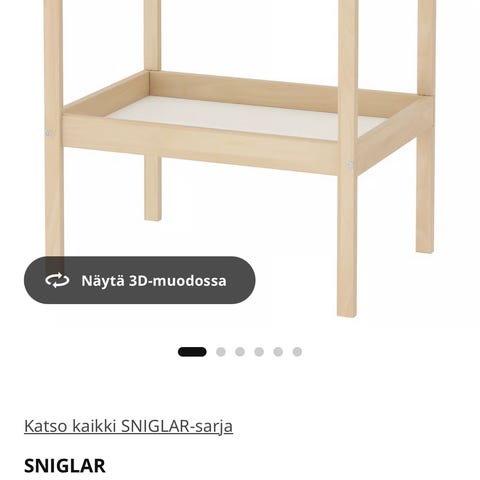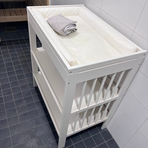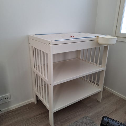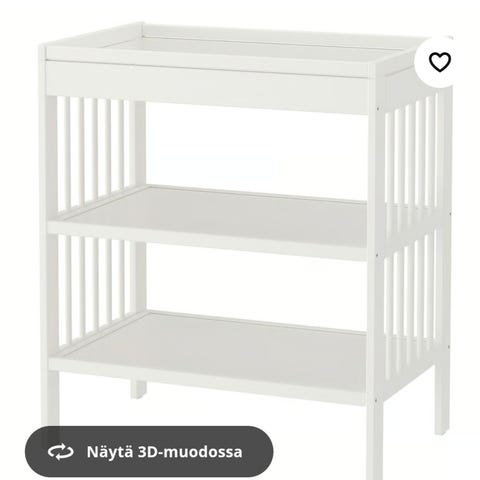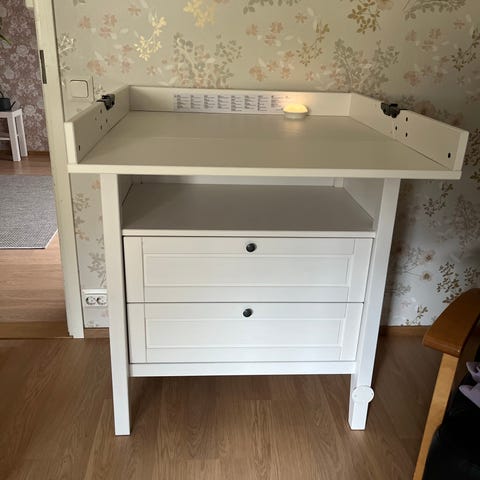 IKEA hoitopöytä valkoinen. Hoitotaso ylhäällä, alla avohylly ja kaksi vetolaatikkoa.