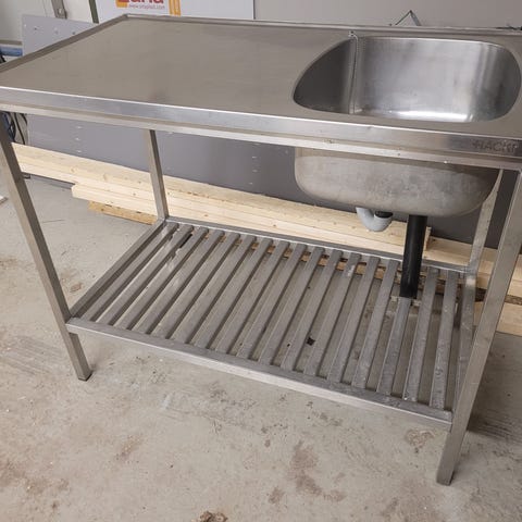 Siisti ja asiallinen kotimainen Hackman tiskipöytä. Suoraan käytöstä seuraavalle. Leveys 160, syvyys 68 ja takaseinän korkeus 20cm. Allas 70x45cm ja syvyys noin 25cm. Tämä ollut siis suurtalouskeittiössä, eli puhdas
