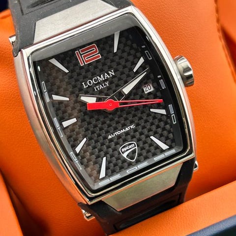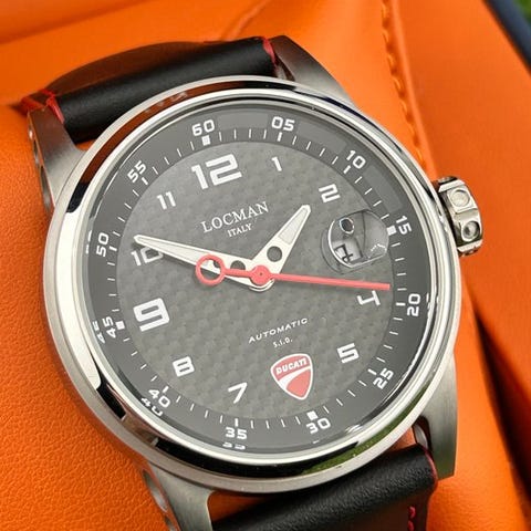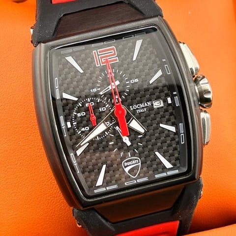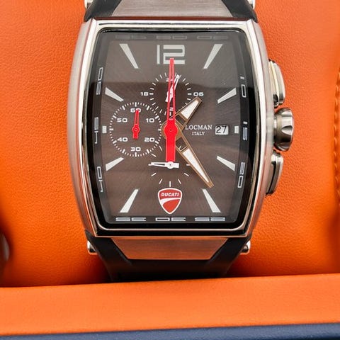 Merkki: LocmanMalli: DucatiLiike: kvartsiKotelon halkaisija: 42 mm ilman kruunuaRannekkeen pituus: 22 cm kokonaispituus (alkuperäinen)Solki: logoituTakakansi: ruuvein kiinnitettäväKellotaulu: mustaKunto: UUSI Virallinen Locman takuuLisävarusteet: Täydellinen setti