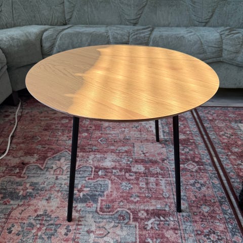 Jämäkkä ja hyvässä kunnossa oleva sohvapöytä. Kannessa pieni rosoinen kohta. Ostettu jyskista noin vuosi sitten. Mitat: leveys 60cm syvyys 60cm korkeus 45cm.