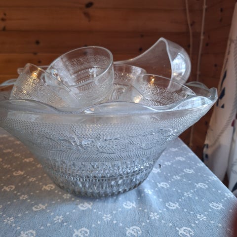 Myydään lehtikuvioinen boolimalja ja kahdeksan kuppia. Maljan halkaisija 31 cm ja korkeus 15 cm.