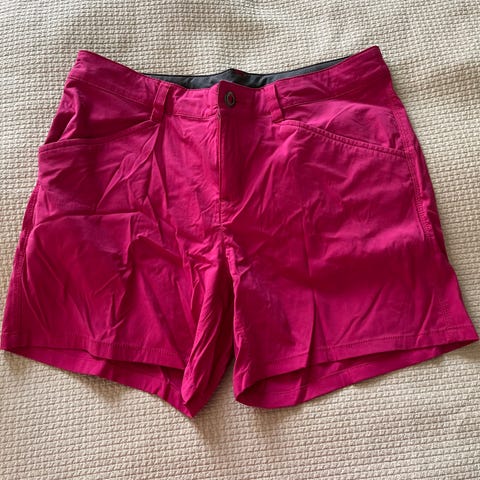 Patagonia shortsit naisille. Koko 36 (lapussa koko 8). Väri siniharmaa. Edessä vetoketju ja nappikiinnitys sekä kiristysnauhat. Takana paikkataskut.
