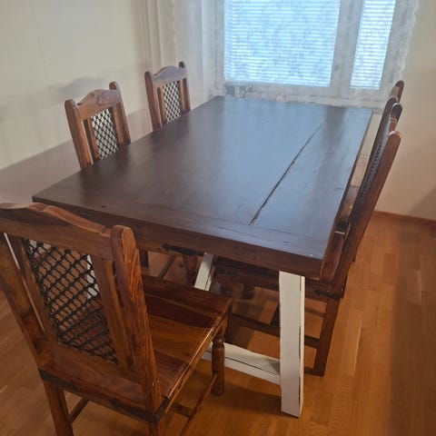 Pöytä on näyttävä rustiikkinen puupintainen (jalava) pyöreä ruokapöytä, jonka ympärille mahtuu hyvin 6 henkeä. Mukana 6 mukavaa ja tukevaa ruokatuolia, joissa pehmustettu istuin ja selkänoja.