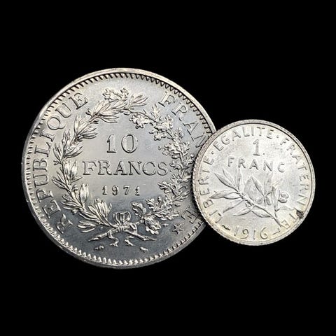 Maailman kolikotRanskaHopeiset 3 x 5 Ranskanfrankkeja (Semeuse) kolikot- 5 Ranskanfrankkia - 1960/1963/19651960-1969Kolikot › Vakiosirtoon tarkoitetut kolikot: 5 frankkia SemeuseHopeiset (.835) • 12 g • ⌀ 29 mmKM# 926, Gad 1789# 770, Franc 2014# 340, Schön# 235, N# 679---------------------------------Toimitustiedot:Meidän tuotteiden kanssa ei ole mahdollista yhdistää toimituksiaAina vakuutettu toimitusNouto myymälästä ei ole saatavilla