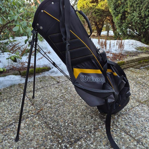 Settiin kuuluu Wilsonin kantotelineellä varustettu golfbägi vetoketjullisilla taskuilla ja kantohihnalla. Bägin väri on tummansininen/musta. Bägi hieman kulunut jostain kohdin.