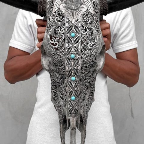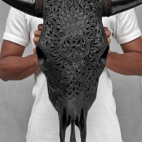 EI VARAUSTA - Aito suuri harmaa käsin veistetty härän kallo - Ketupat-motiivi