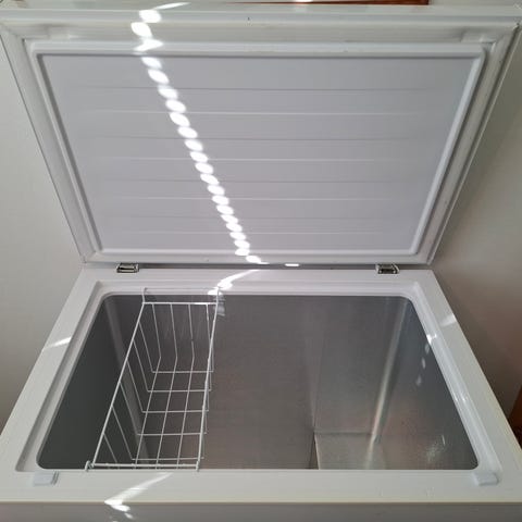 Toimiva arkkupakastin, kansi taittunut yli. Saranoiden korjauksella saa toimimaan kuin pitää (nyt käytetty niin että paino kannen päällä pitää kiinni).