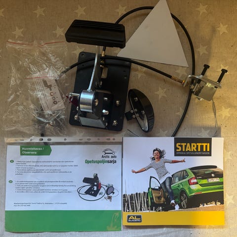 Laadukas ja jämäkkä opetuspoljin. Ei nitku eikä notku. Ollut yhdellä oppilaalla, eli kuin uusi. Vaijerin muovikuori muutamasta kohtaa rikki, siksi kuntoluokituksena "hyvä". Jäljet tulleet pujotellessa keskikonsolin välistä, mutta sisällä vielä metallinen sisäkuori, jossa vaijeri kulkee, niin on vaan kosmeettinen, eikä vaikuta millään lailla käyttöön tai kuntoon. Kuvassa oleva pohjavanerin pala ei sisälly kauppaan lähetettäessä. Noutaessa saa toki mukaan.