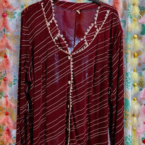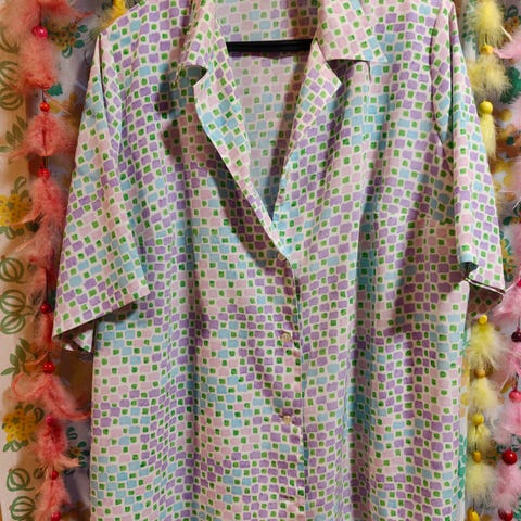 Valkoinen paita jossa kuvioita sini,vihertävillä väreillä. Taskullinen. Made in hong kong.