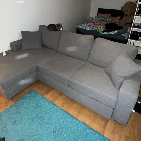 Taloudessa koiria, lapsia ym, mutta sohva on hyvässä kunnossa.