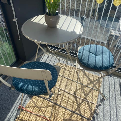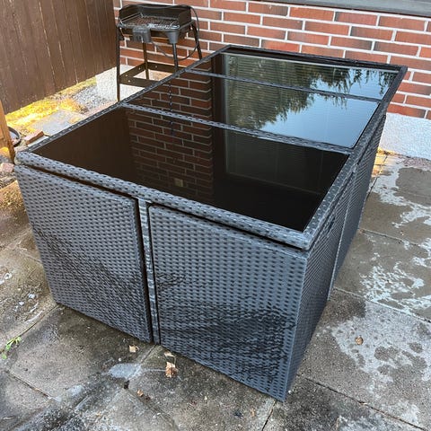 Kevät tulla jolkottaa. On aika laittaa pihat ja puutarhat kuntoon. Tästä lasisella pöytälevyllä varustettu pöytä ja neljä tuolia! Halkaisija 110cm, korkeus 75cm.