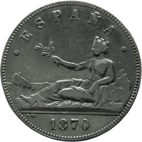 Maailman kolikotEspanja- 5 Pesetas - Amadeo I1871 (1871-1875)Kolikot › Yleiskäyttöön kiertoon tarkoitetut kolikotHopea (.900) • 25 g • Ø 37 mmKM# 666, Cal# 5-12, Aureo# 1.2, 1.3, jne., N# 7733---------------------------------Toimitustiedot:Toimitusten yhdistäminen ei ole mahdollistaAina vakuutettu toimitusNouto myymälästä ei ole saatavilla