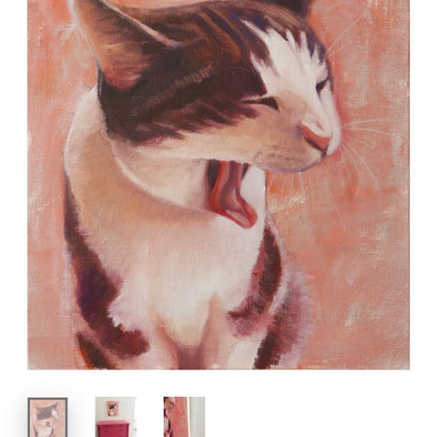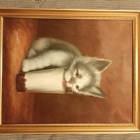Tässä hyväkuntoinen kissan muotokuva -aiheinen taulu. Teoksessa on frakkiin ja koristeelliseen univormuun pukeutunut mustavalkoinen kissa tummalla taustalla.