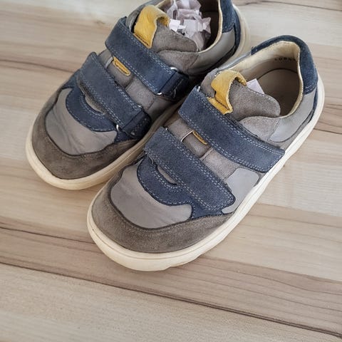 Nahkaiset välikausikengät. Pohjan ompeleet vaativat korjauttamista suutarilla. Tummansininen väri kulunut mutta pinta on ehjä kuitenkin. Tarrat pitää. Nahka- ja villapohjalliset. Kokomerkintä on kulunut, mutta nahkapohjallisen pituus 20 cm.