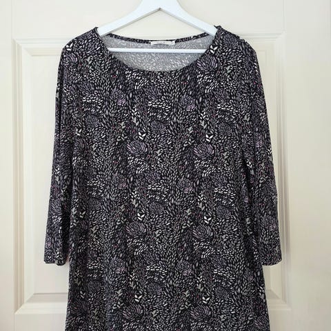 Naisten siniharmaa pusero, koko M. Materiaali 70 % viskoosia ja 30 % polyamidia, pinnassa nukkaa. Puserossa on pyöreä pääntie ja 3/4-pituiset hihat. Kai-kai n. 55 cm, olka-helma n. 68 cm.