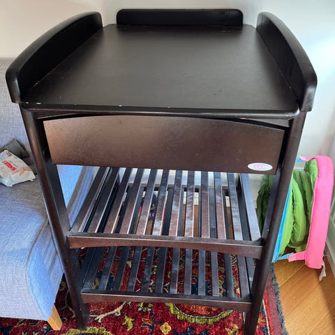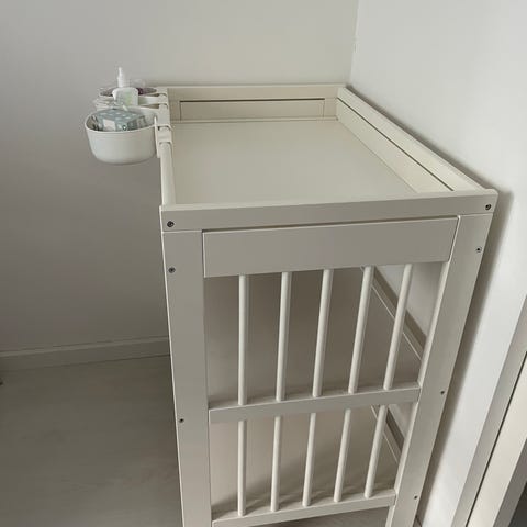 Hoitotaso ylhäällä, alla kaksi avointa tasoa sekä vedettävä säilytyslaatikko hoitotarvikkeille. Pyörät jaloissa, joten pöytää on helppo siirtää.