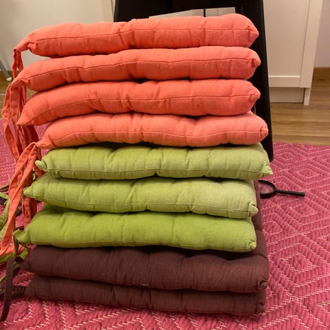 Upouudet ja käyttämättömät pehmoiset roosanväriset istuintyynyt. Keinomateriaalia ja halkaisijaltaan 34 cm.