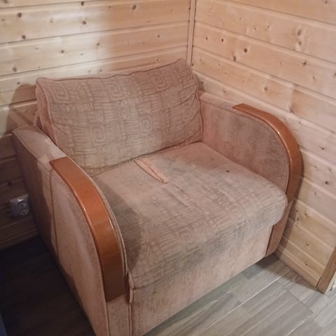 Pieni limenvihreä säkkituoli.