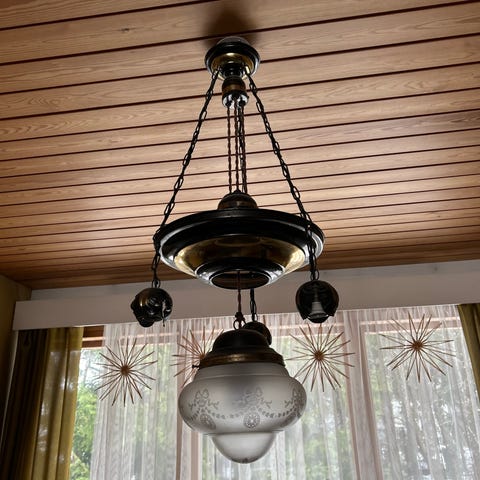 Myydään vanha katto lamppu. 2 kristallia puuttuu.Sokeripala kiinnitys. Toinen pöytälamppu ,kupu puuttuu.Hinta 20 e kpl .Kulkeutuu pk seudulla.