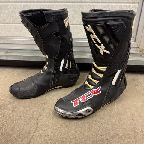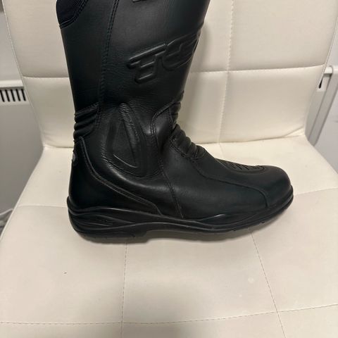 TCX nahkaiset goretex ajosaappaat. Kokolapussa 38, mutta oikeampi koko 37. Nykymalli taitaa olla Tourer tai Explorer, nämä muutama vuosi sitten ostettu mutta käyttämättömät, nilkan kulma ei vaan käy itselle. Huippulaadukkaat, kevyet ja mukavat jalkaan. Pinnassa tehtaan kyllästeet ja rasvat, voisi tykätä rasvauksesta ennen käyttöä. Ei moitteita, pölyt putsaan ennen kauppoja.