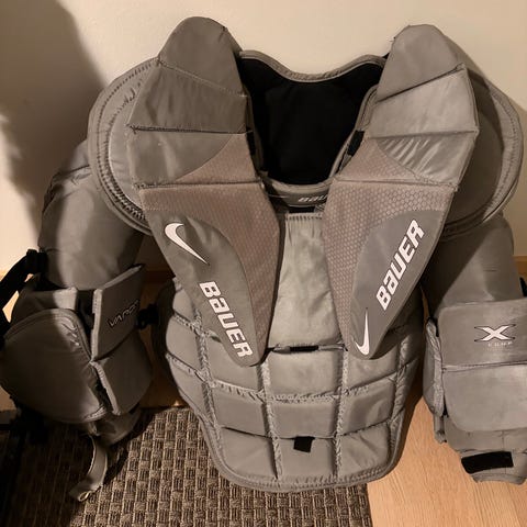 Jääkiekkomaalivahdin rintapanssari Bauer Elite. Koko Int large, eli junnu iso. Mukaan myös kuvassa olevat munasuojat.