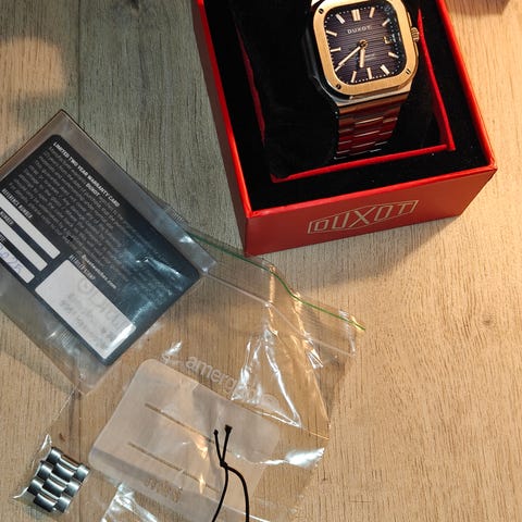 Uusi.Olemme koruyhtiö, joka myy ainoastaan uutta, eksklusiivista tuotetta. Kaikki kellomme ovat täydessä, virallisessa takuunassa.Tyylikäs kellon kappale Duxot-brändiltä. Perustettu Sveitsin yhtiöksi vuonna 1943, heillä on pitkä historia laadukkaiden kellojen parissa.Kello tulee korkealaatuisella automaattisella liikkeellä, jossa on 24 jalokiveä ja vaikuttava 42 tunnin virrankesto. Rajoitettu erä, vain 75 kpl saatavilla maailmanlaajuisesti. Saat satunnaisen numeron.316L kultahartsin ruostumattomasta teräksestä kotelo ja ranneke. Vahva safiirilasi.Vahvin vaikuttavuus on autenttinen, Lapidary Magnesite -kivikello. Siinä on uskomaton kuosi.Kotelon materiaali316L Gold stainless steelKellonnäyttö (Dial)Aito Lapidary Magnesite -kivinen näkökohtaLiikeAutomaattinen 24 jalokiveäVirrankesto42 tuntiaRannekkeen materiaali316L Gold stainless steelRajoitettu eräKyllä, 1 - 75. Saat satunnaisen numeron.DattoimintoKyllä, suurennuslasillaKotelo Ø40 mmLisävarusteetViralliset laatikot ja asiakirjatLähetys vakuutettuna ja Track & Trace -koodilla.Kaikki uutta.