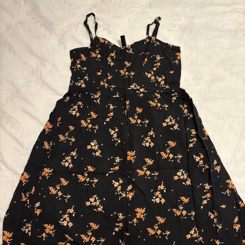 H&M naisten mekko, koko 34. Hihaton, ohuilla olkaimilla varustettu malli. Mekossa on punainen pohjaväri ja valkoinen kukkakuvio. Sopii käytettäväksi arki- tai kesämekkona.