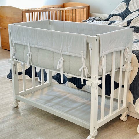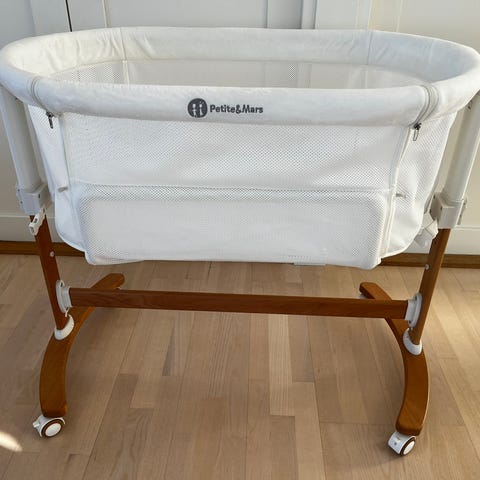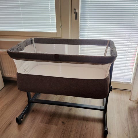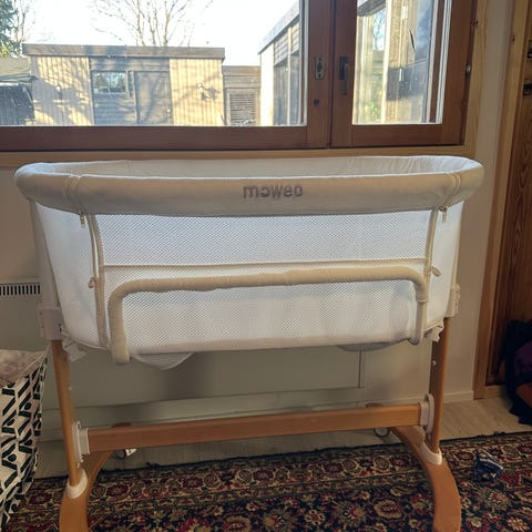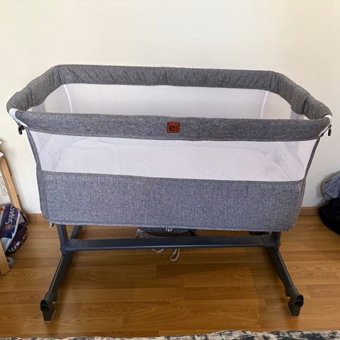 Moweo Alex sivuvaunusänky vaaleanpunaisena. Ostettu uutena vauvalle, mutta hän ei nukkunutkaan tässä ollenkaan. Koottu kerran ja purettu omaan kantokassiin. Valmiiksi osissa siis, helppo kuljettaa 👍🏼