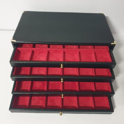 Kolikkoteline mustaa keinonahkaa 48 paikkaa6 irrotettavaa laatikkoaSisäosa mustaKullanväriset pienmetalliosatMitat 34 x 24 x 19 cmSisäisten jakajien mitat: noin 7 x 7,5 cmKolikkoteline on täysin käsin valmistettu laadukkaista materiaaleista.Valmistettu puusta ja keinonahasta.Erinomaisessa kunnossa, kuin uusi.Huolellinen toimitus