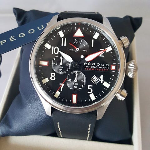 Uutta. Vähittäismyyntihinta 450 €.Olemme korukellotalo, joka myy vain uusia, eksklusiivisia tuotteita. Kaikilla tuotteillamme on täysi virallinen takuu. Asiakirjat allekirjoitetaan ja leimataan omasta kelloseppätiimistämme.Ainutlaatuinen kellonäyte kuuluisalta brändiltä Pégoud, joka tunnetaan sen eksklusiivisista pilottikellosta automaattiliikkeellä jo 1900-luvun alkuajoista. Kunnianosoitus WWI:n pilottisankarille Adolphe Célestin Pégoudille.Erikoismalli täsmällisellä Seiko mecha-quartz -mekanismilla. Pitää tarkan ajan, ja sekunnit lipuvat kuin automaattikellossa. Päivätoiminto sekä päivämäärätoiminto, lisäksi miellyttävä 24 tunnin toiminto.Kotelon materiaaliRuostumaton teräsPannan materiaaliKorkealaatuinen nahkaLiikeSeiko mega quartz, pyyhkäiseväKiven/crystal materiaaliNaarmankestävä mineraalilasiKellotaulun Ø44 mmPäivätoimintoKylläPäivämäärätoimintoKyllä24 tunnin toimintoKylläPakkausTäydennetty laatikollinen kaikkine virallisine asiakirjoineenToimitus vakuutettuna ja Track & Trace -seurantalinkillä.Kaikki uutta.