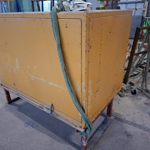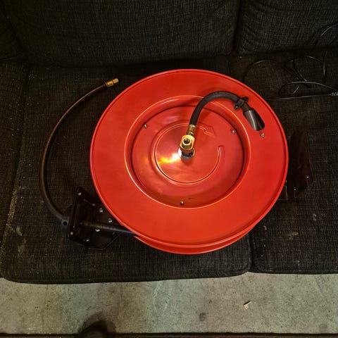 Siitä toimiva paineilmaletkukela. Kelassa reilu 10m letkua. Metallinen runko. Sijaitsee Sysmän taajamassa. Myynnissä myös muualla.