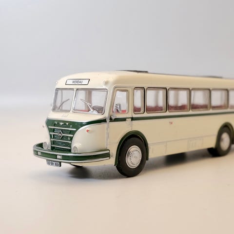 Linja-auto pienoismalli, jossa vaaleansininen kori ja punaiset yksityiskohdat. Mallissa on yksityiskohtaisesti toteutettu ohjaamo, ikkunat ja sisätila istuimineen. Sopii esimerkiksi keräilyyn, esille laitettavaksi tai rekvisiittakäyttöön. Mittasuhde 1/72.
