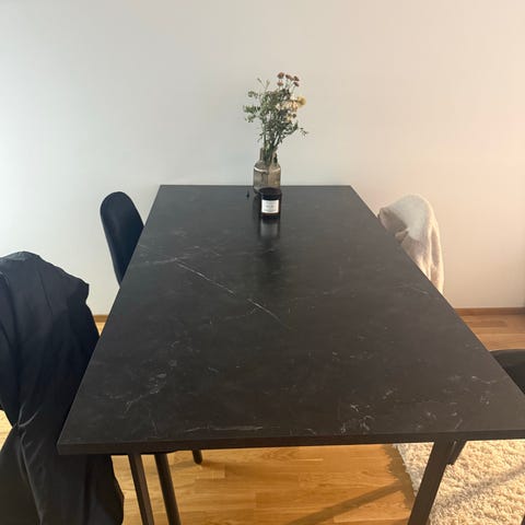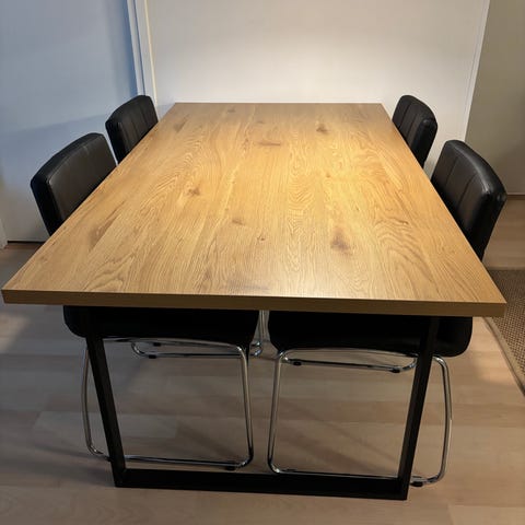 Hyväkuntoinen vähän käytetty kuuden hengen ruokailuryhmä. Pöytälevy tammea ja muutoin umpipuuta myös ja valkoinen. Koko 90x180cm