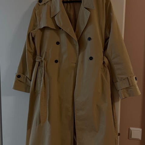 Mango pitkä takki naisille, koko XS. Väri beige. Materiaali puuvillaa. Kaksirivinen malli. Takana halkio ja vyötäröllä säädettävä vyö. Sopii käytettäväksi kevät- ja syystakkina. Erinomainen kunto.