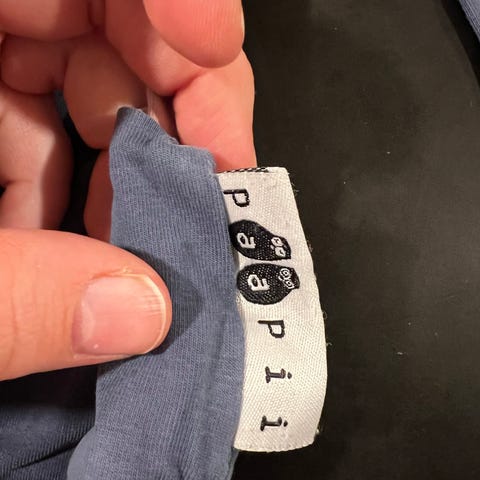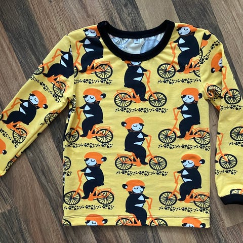 Paapii lasten pitkähihainen trikoopaita, koko 98 cm. Kunto muuten hyvä, mutta kynän osoittamassa kohdassa tahra, joka ei ole lähtenyt normaalipesussa. Pinnassa hieman pesuhaitua.